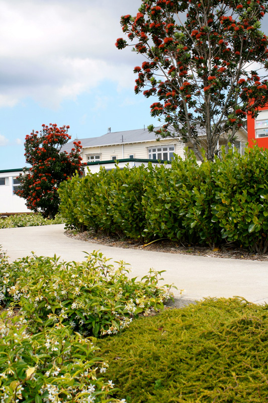 Situated on a steep, difficult site this preschool carpark needed a major facelift. Large 'bands' of massed ground cover appear like large brush strokes across the slopes. The Red flower of Metrosideros Maori Princess complements the building colour and attracts much attention from the street.